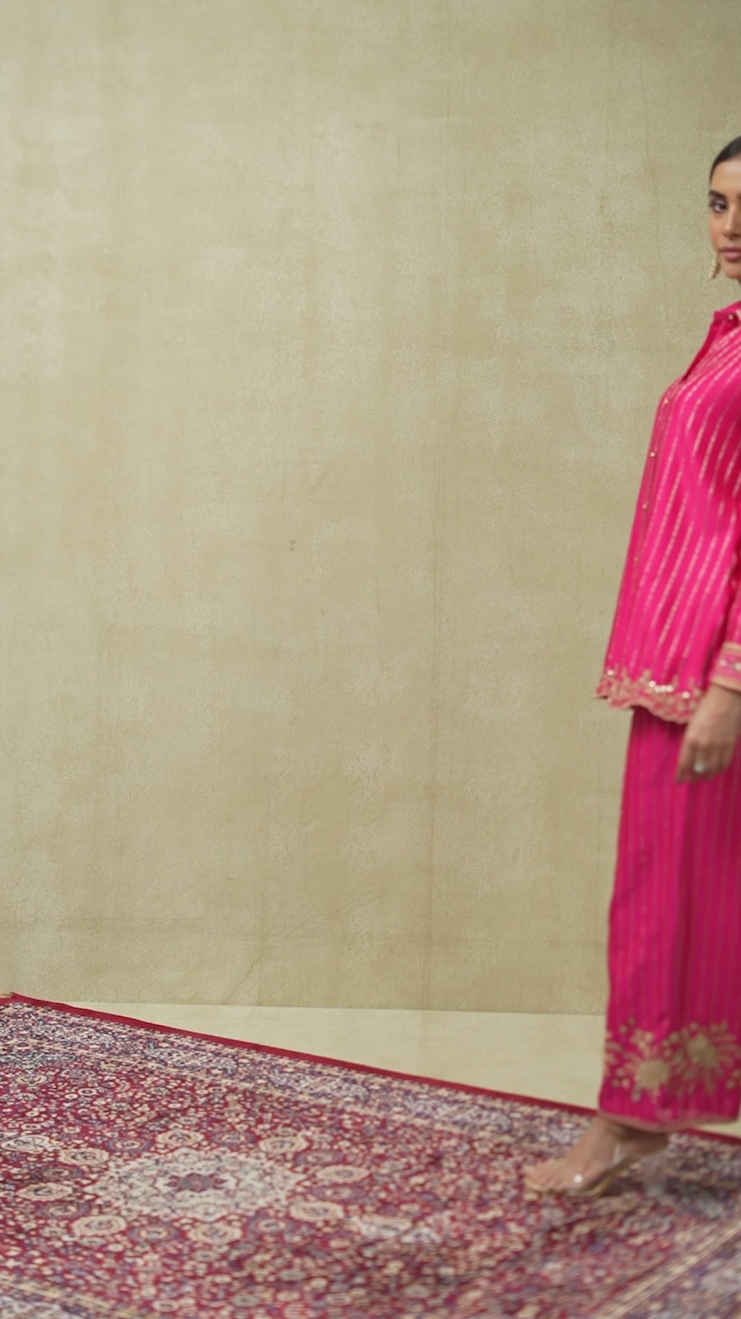 Step into timeless elegance with Aarvi, a hot pink co-ord set crafted in the exclusivity of Banarasi weave and zari jacquard. The luminous fabric reflects the finesse of traditional artistry, reinterpreted through a contemporary silhouette. Paired with flared trousers in silk chanderi jacquard, this ensemble balances heritage detailing with modern ease. A statement in refined festivity — perfect for intimate gatherings, celebrations, and evenings that call for quiet grandeur.