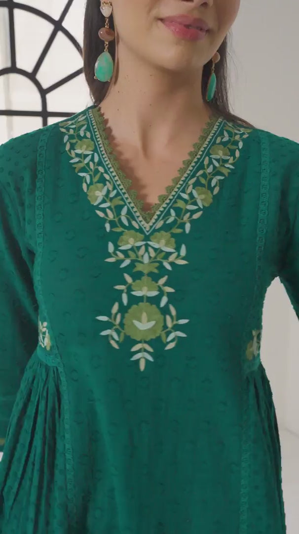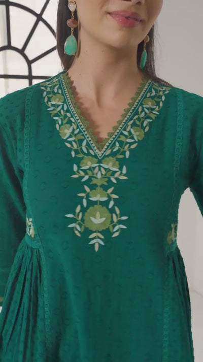 Aizah Emerald Green Cotton Slub Jacquard Handcrafted Kurta Set with Aari Embroidery