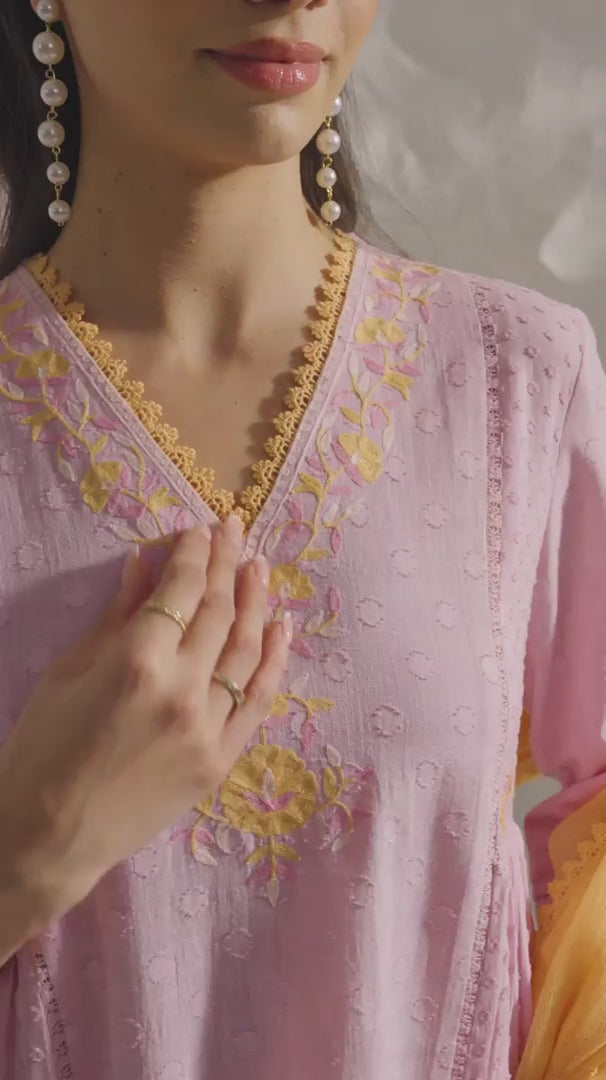 Soft, radiant, and beautifully detailed, this A-line kurta set brings together feminine charm and effortless sophistication in equal measure. Crafted in lavender cotton slub jacquard, the kurta carries a rich textured finish that feels light, breathable, and refined. Delicate Aari embroidery, pintucks, and lace accents add depth and artisanal elegance to the silhouette, creating a look that feels graceful and thoughtfully crafted. Paired with cotton slub palazzo pants, finished with delicate lace, the set offers fluid movement with an added touch of softness and detail. A light orange Kota dupatta, edged with lace, completes the ensemble with a warm contrast and an airy finish