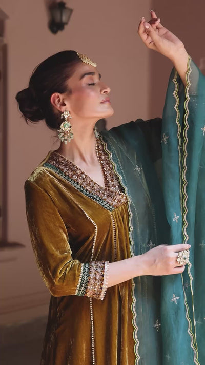 Anokhi Mustard Embroidered Silk Velvet Handcrafted Kurta Set Sale price ₹26,450