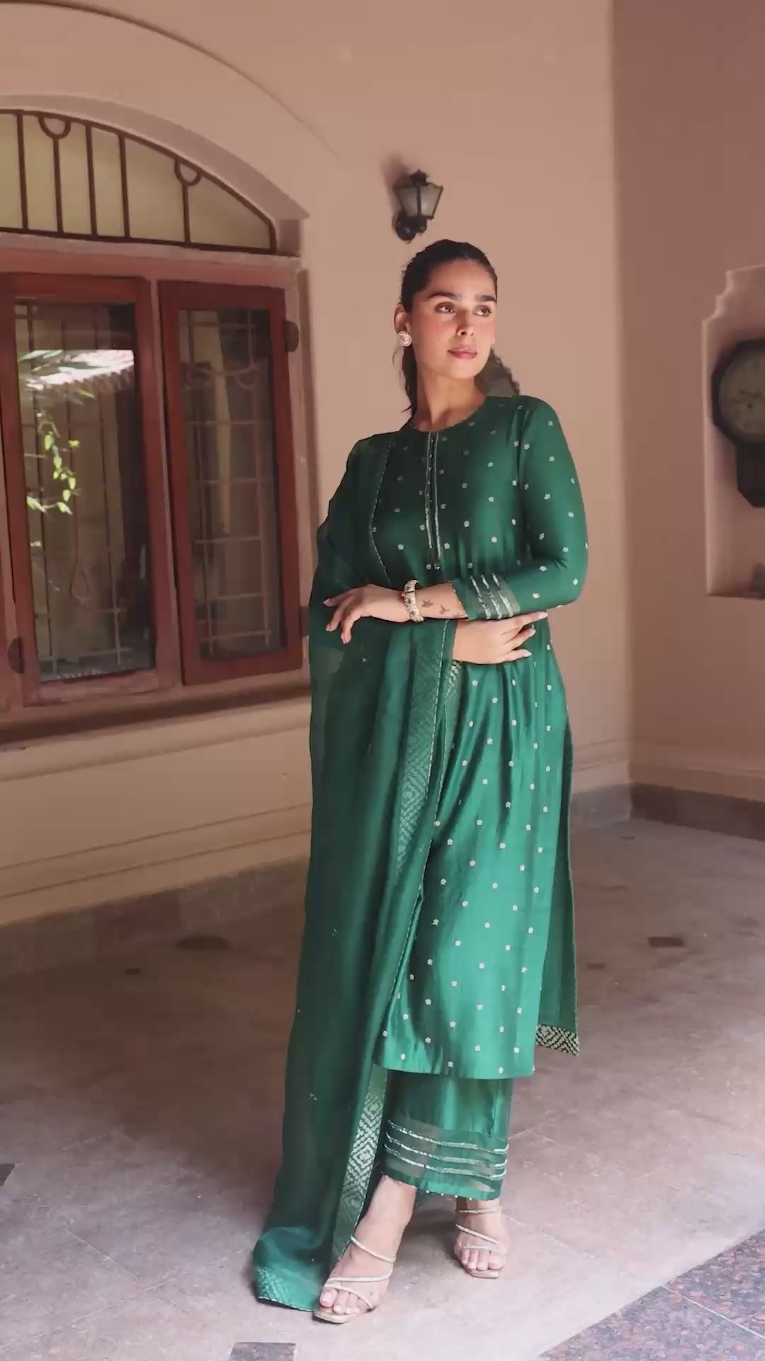 Embrace timeless elegance with Chand, an emerald green straight kurta set perfect for festive celebrations. The straight kurta is crafted in luxurious silk chanderi jacquard and features a delicately beaded neckline for a subtle shimmer. Paired with palazzo pants for effortless style, the ensemble is completed with an organza dupatta adorned with embroidered borders, adding a refined festive touch to every look.