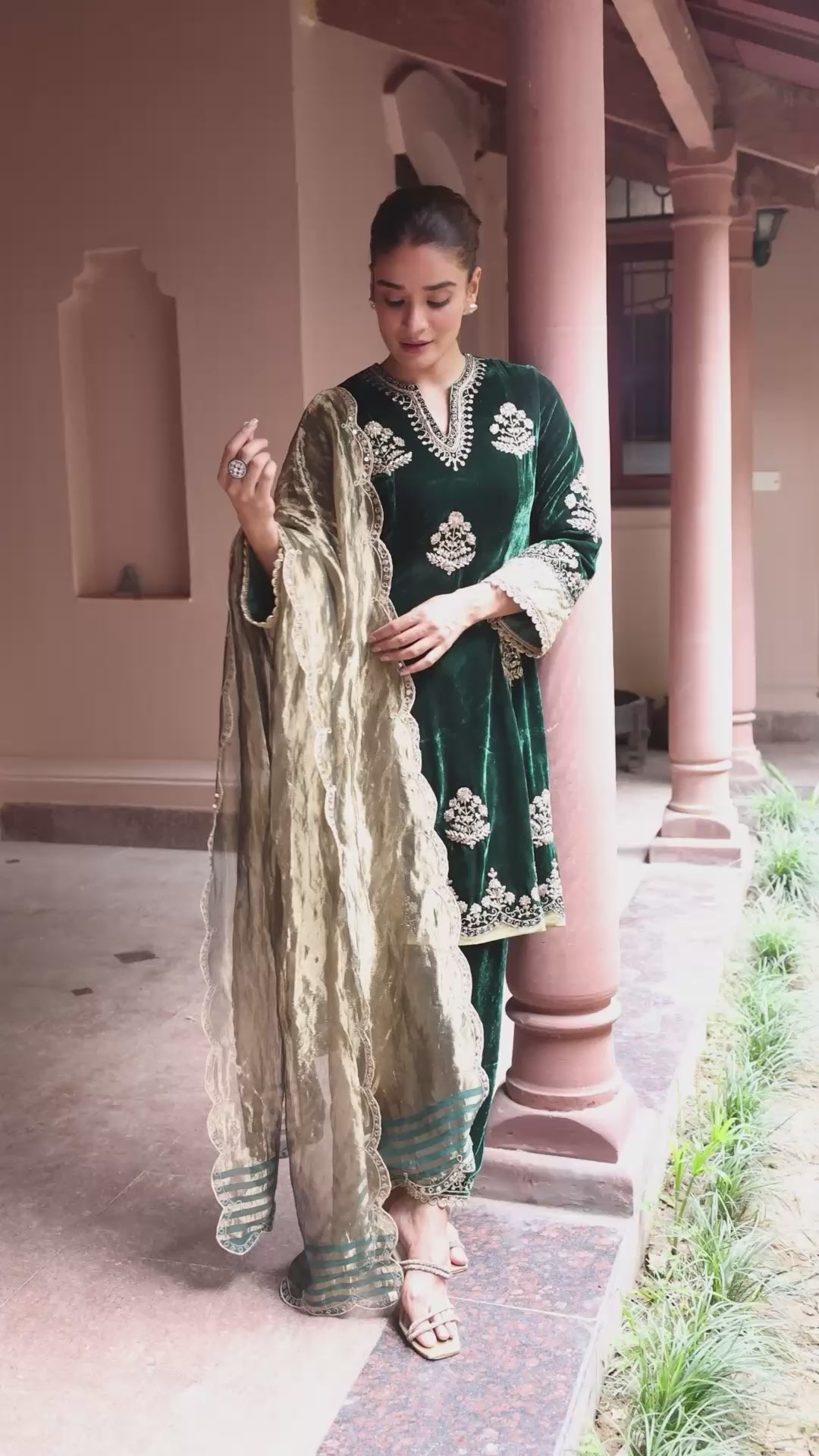 Step into festive opulence with Dilruba, a forest green A-line short kurta set crafted in luxurious silk velvet. The kurta is adorned with intricate manual Dori and Adda embroidery, Nakshi, sequins, and Zari work, featuring floral motifs all over with special detailing on the neckline, sleeves, and hem. Paired with matching salwar bottoms for effortless comfort, the ensemble is completed with a forest green pure tissue silk dupatta, enriched with manual Dori, Zari, and Adda embroidery — perfect for poojas, festive celebrations, and grand gatherings.