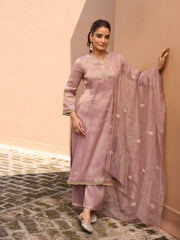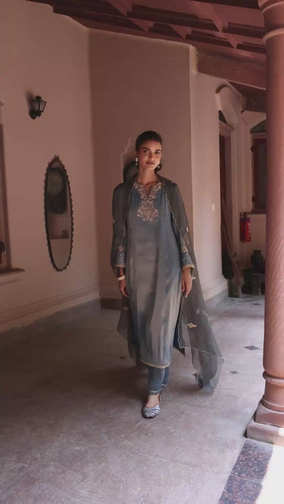 Celebrate the season in artisanal elegance with Divani, a cobalt blue straight kurta set crafted for festive occasions. The straight kurta features delicate floral embroidery on the neck and sleeves, complemented by lace detailing on the sleeves and hem. Paired with straight palazzo bottoms in a tissue blend for effortless comfort, the ensemble is completed with a tissue zari kota dupatta adorned with floral embroidery throughout and intricate embroidered borders, making this set perfect for poojas, festivities, and celebratory gatherings.