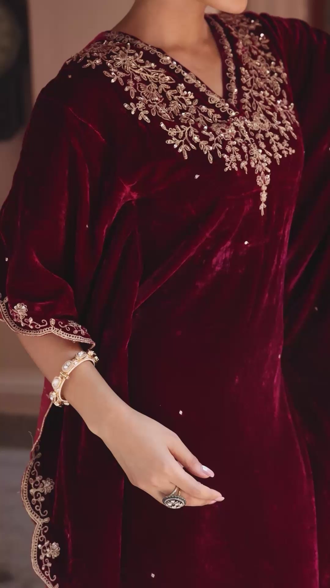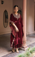 Firoz Red Embroidered Silk Velvet Kaftan Set (READY TO SHIP)
