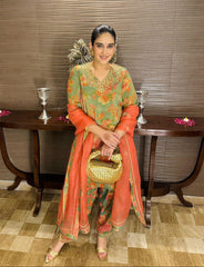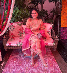 The Gulbahar Kurta Set, a floral printed tissue ensemble that radiates charm and grace. Paired with a classic salwar and a pure silk organza dupatta, this set offers an effortlessly elegant look. The kurta is beautifully enhanced with intricate embroidery, featuring fine zari, dabka, sequins, and gota work, adding a touch of artisanal luxury to the delicate floral print.