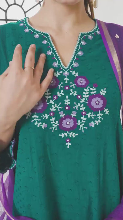 Rich in colour and refined in detail, this A-line kurta set is designed to make an elegant statement with ease. Crafted in emerald green cotton slub jacquard, the kurta carries a beautifully textured finish that feels breathable, polished, and elevated. Delicate Aari embroidery with scalloped detailing, pintucks, and hand embroidery lend depth and artisanal character to the silhouette, creating a look that feels graceful and thoughtfully crafted. Paired with cotton slub palazzo pants, the set offers comfort with fluid movement and effortless charm. A purple Kota dupatta, finished with hand embroidery, completes the ensemble with a rich contrast and a soft layer of sophistication.