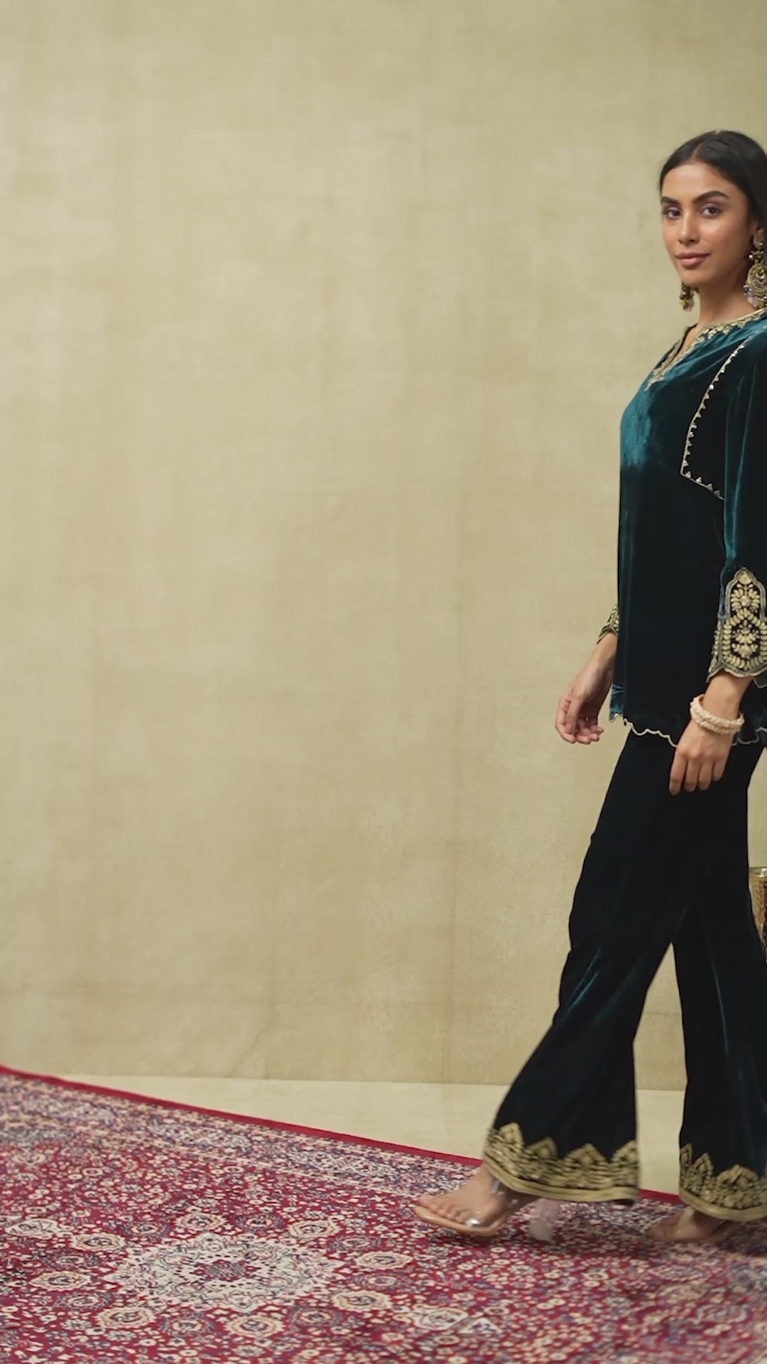 Step into understated grandeur with Rida, a midnight blue co-ord set crafted in opulent silk velvet. The silhouette features manual dori, zari, and adda embroidery detailed with sequins, beads, and delicate scallops — adding refined texture and glow. Paired with flared trousers in matching silk velvet, this ensemble blends richness with ease, perfect for evening celebrations and winter festivities.