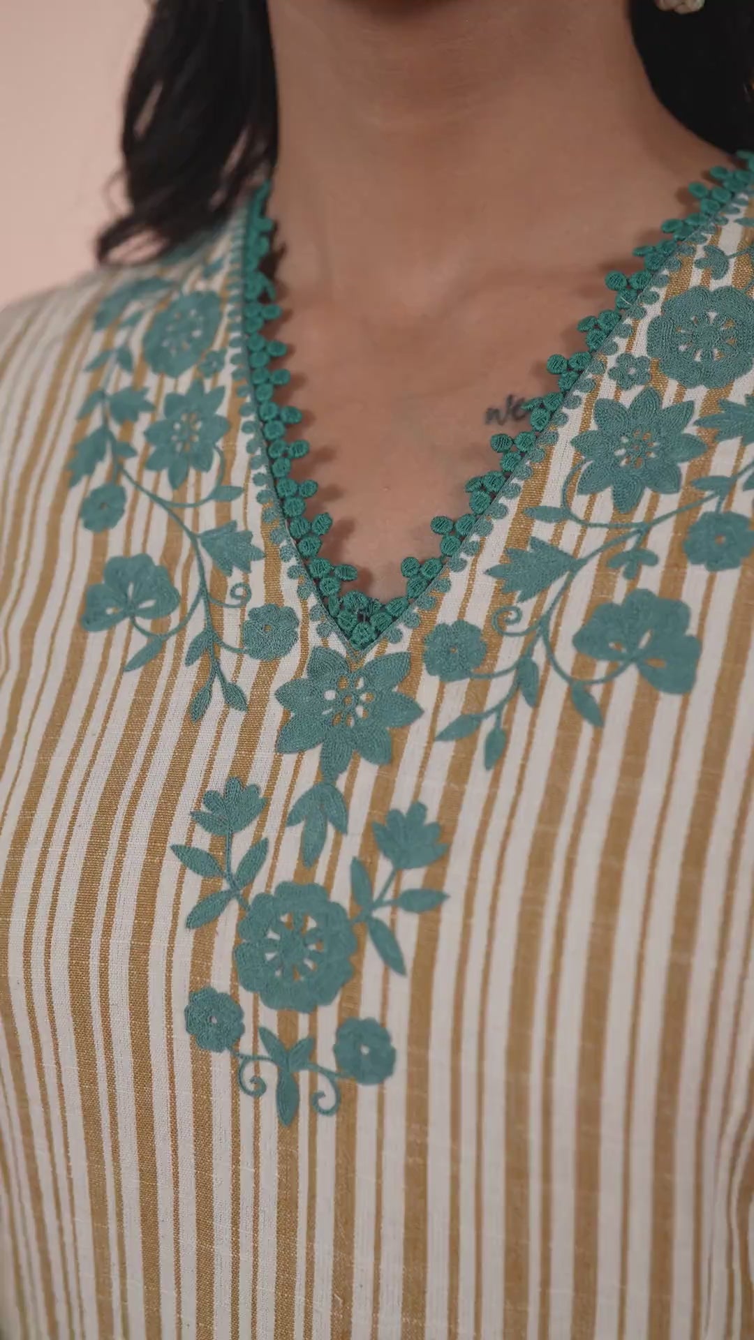 Welcome the warmth of the season with Saanjh Mustard Yarn Dyed Straight Kurta Set, a perfect blend of tradition and modern charm. This ivory and mustard straight kurta, crafted in 100% cotton slub stripes, features intricate aari embroidery on the sleeves and neckline, adding timeless elegance to its earthy hues. Paired with off white and mustard straight pants, adorned with matching embroidery, it offers effortless sophistication. The look is beautifully tied together with a Green Bemberg jacquard dupatta, finished with delicate lace border. Light, breathable, and refined—Saanjh is your go-to for understated grace this season