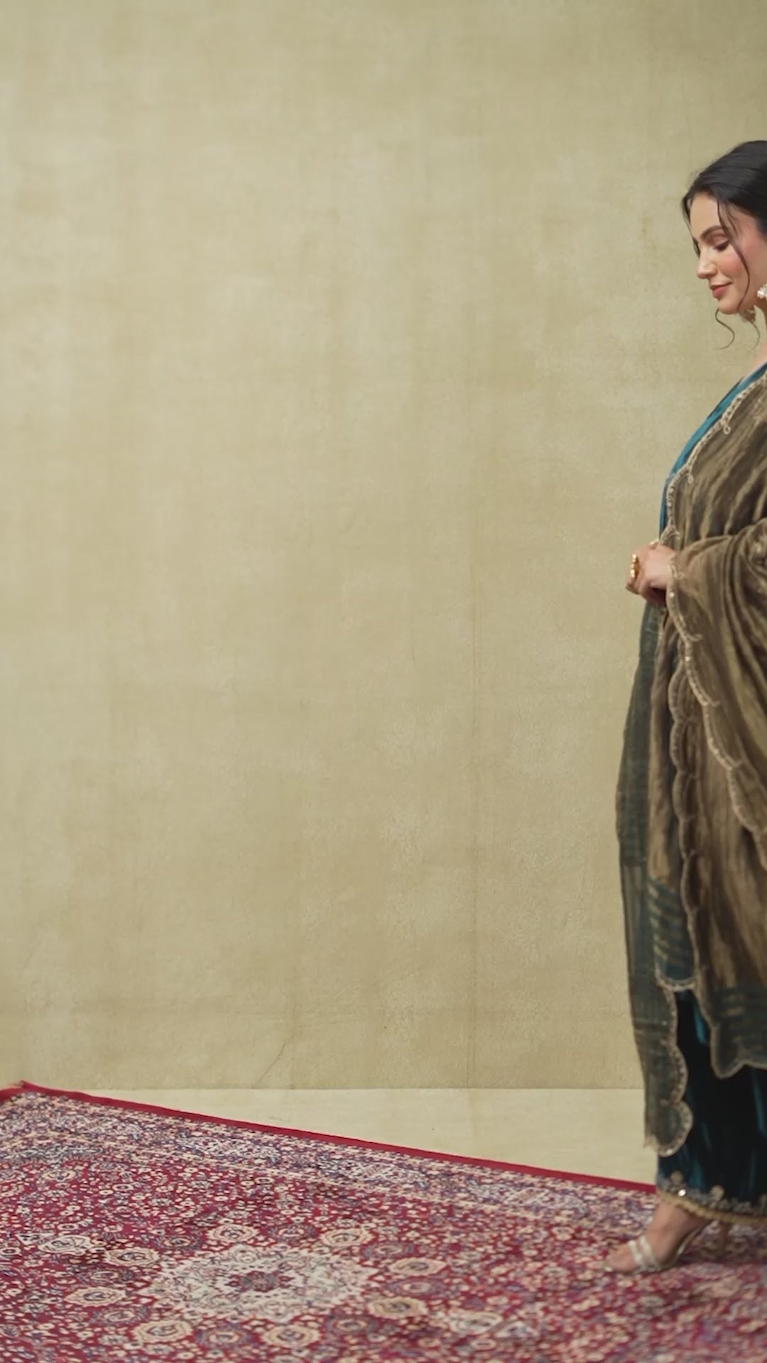 Immerse in understated opulence with Samira, a midnight blue silk velvet kurta set crafted for evenings of quiet grandeur. The kurta features manual dori and adda embroidery with nakshi, sequins, zari, and gota, adding depth and delicate shimmer to the rich velvet base. Paired with straight pants in matching velvet and a pure silk tissue chanderi dupatta, this ensemble is a celebration of texture, craftsmanship, and timeless elegance, perfect for winter festivities and intimate celebrations.