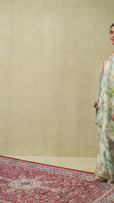 Radiate festive elegance with Tanisha, a light turquoise co-ord set crafted in lightweight chanderi. The floral cape features manual dori, zari embroidery, and adda work detailed with dabka and sequins, adding gentle shimmer to the silhouette. Paired with flared trousers and a matching bustier, this ensemble captures effortless sophistication — perfect for daytime celebrations and intimate gatherings.