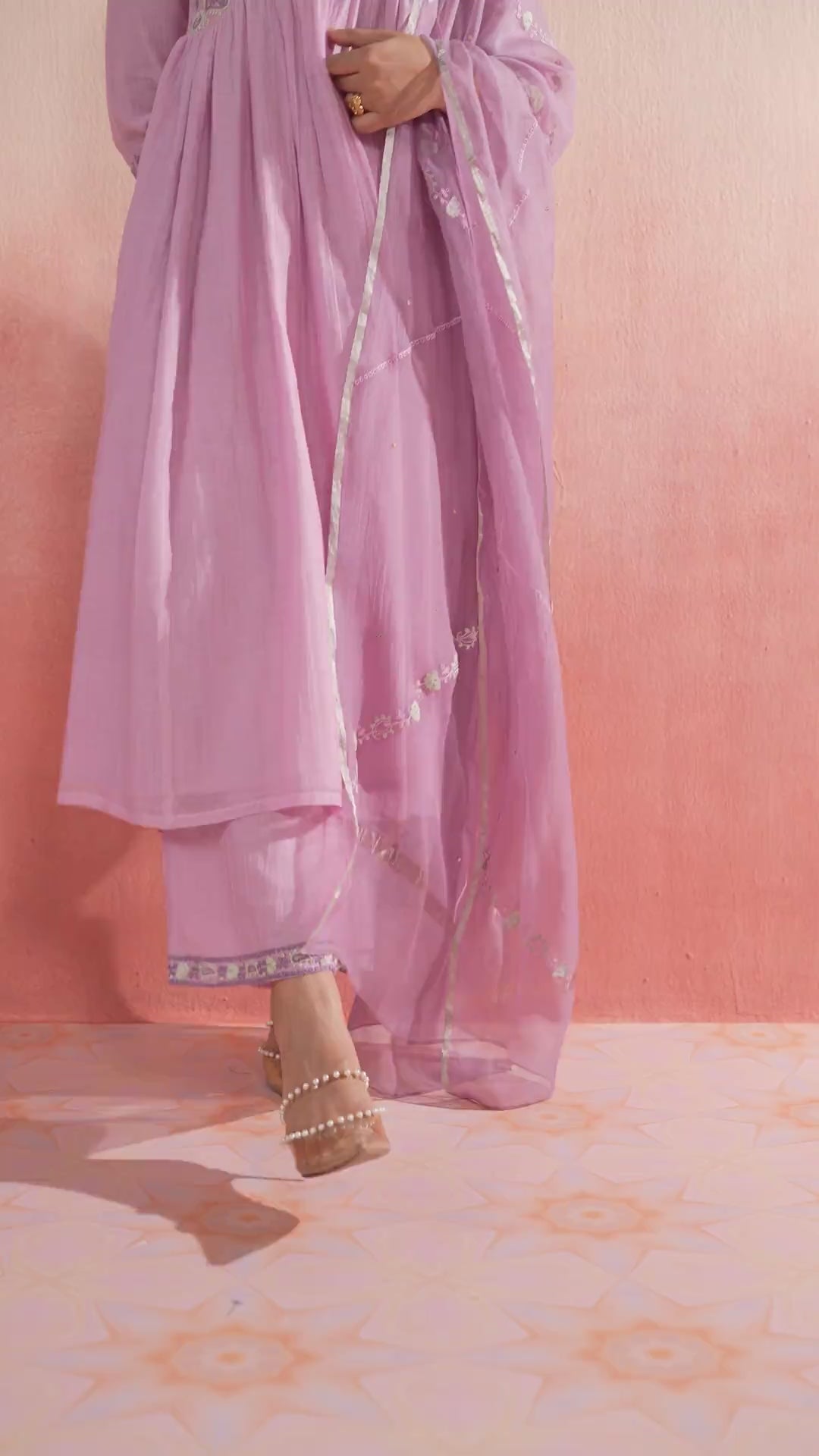 Embrace the warmth of the season with Tarini Lavender Anarkali Set, a timeless blend of elegance and tradition. This Lavender Anarkali, crafted in a luxurious cotton silk blend, is adorned with intricate Dori and Adda embroidery, adding a touch of artisanal charm. Paired with flowing palazzo pants in a matching hue, detailed with delicate embroidery, it ensures both grace and comfort. The look is completed with a dark lavender dupatta, featuring exquisite Dori and Adda work, bringing richness and depth to the ensemble. Light, fluid, and effortlessly sophisticated—Tarini is perfect for those who love understated opulence.