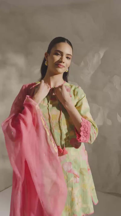 A charming blend of print and movement, this short straight kurta set brings a fresh, feminine sensibility to everyday dressing. Crafted in printed cotton dobby in a green and pink palette, the kurta feels light, breathable, and easy to wear, while lace accents and tassel detailing add softness and playful character to the silhouette. Paired with printed farshi bottoms, the set creates a fluid, graceful fall that feels both relaxed and refined. A rose pink Kota dupatta, detailed with intricate adda embroidery, completes the look with a touch of richness and a beautifully romantic finish.