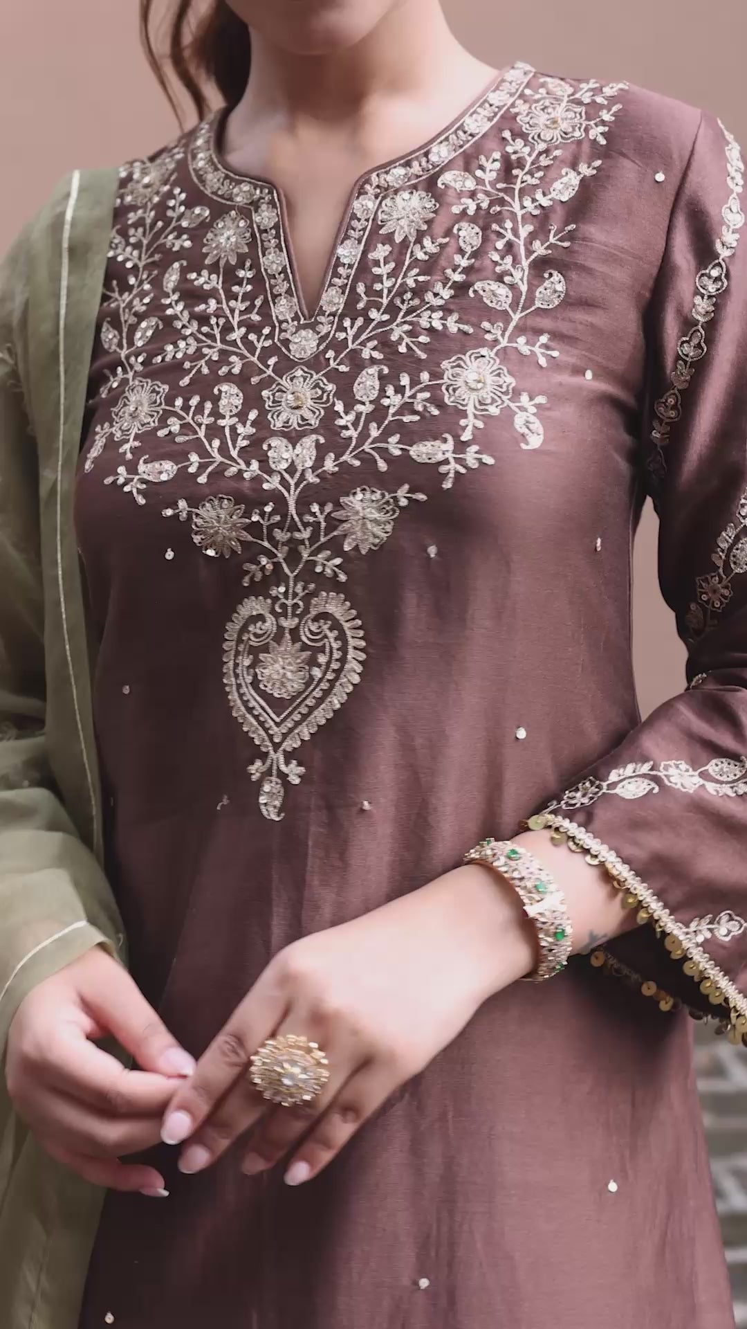 Celebrate the season in soft elegance with Zeenat in Mocha Mousse. The straight kurta is adorned with delicate embroidery on the neck and sleeves, finished with lace at the hem for a refined festive touch. Paired with straight palazzo bottoms, it blends comfort with style effortlessly. The sage green embroidered dupatta adds a gentle pop of contrast, making this set perfect for poojas, intimate gatherings, and all your seasonal celebrations.