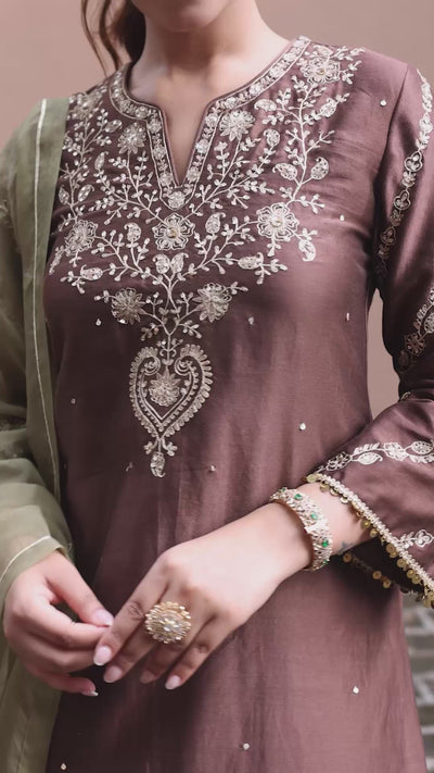 Zeenat Silk Chanderi Embroidered Mocha Mousse Straight Kurta Set